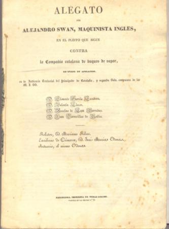 Procesos celebres -- ALEGATO POR ALEJANDRO SWAN,MAQUINISTA INGLES,En el pleito que se sigue contra la Compañia Catalana de Buques de Vapor